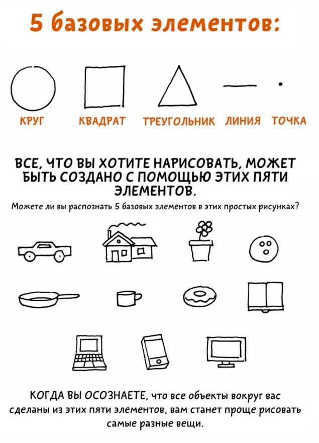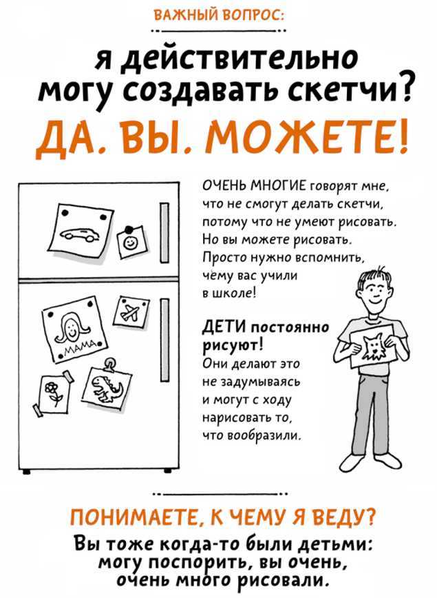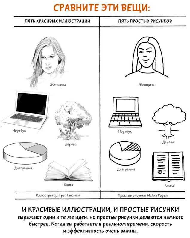 Как вы помните, Роэм обнадеживал читателей: вы сможете рисовать – если способны нарисовать хотя бы круг, квадрат, стрелку и самого простого человечка. Роуди идет еще дальше: «Не важно, верите ли вы в свой талант рисовальщика или нет – я утверждаю, что каждый, кто способен держать ручку, может извлечь пользу из этой книги. Суть – в занесении на бумагу важных идей, а вовсе не в умении хорошо рисовать. Вы совершенно точно можете создавать скетчи. Я покажу вам, как рисовать простые объекты, создавать собственные шрифты и и использовать разные нарисованные элементы, чтобы визуально выражать свои мысли. Даже если вы не способны нарисовать прямую линию, вы сможете научиться делать визуальные заметки – потребуется только практика».