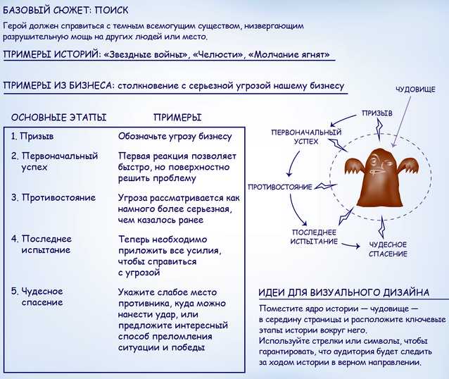 Речь. Не содержит визуальных или письменных компонентов, но, как и в случае с доской, одностраничная визуальная история определяет структуру рассказа. Мы много раз видели, что докладчики пользуются одностраничной визуальной историей как шпаргалкой, позволяющей им просто рассказывать историю.