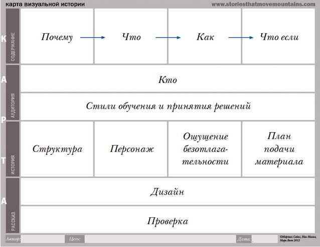 «Для презентации визуальной истории можно использовать самые разные форматы. Начните с создания одностраничной визуальной истории в виде схемы, объединяющей изображения и текст в краткую презентацию. Считайте это своим ресурсом или деревом с фруктами, которые можно собирать в разное время. Создайте хороший дизайн одностраничной визуальной истории, а остальное – приложится. Композиция, содержание, кодирование и формулировки из одностраничной визуальной истории могут обеспечить согласованность всех форматов, которые вы хотите создать.