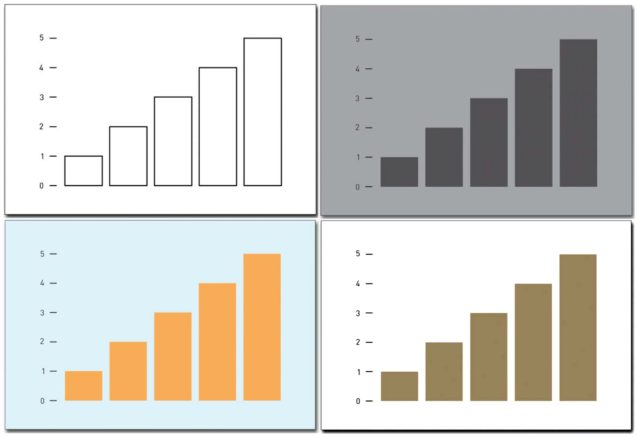 На первой картинке внизу представлена столбцовая диаграмма, созданная без регулирования настроек. Она предельно проста. Но если вы хотите сделать свою графику более заметной, вам для этого, возможно, будет достаточно просто добавить в нее цвет. Более темные тона лучше применять с мрачными темами. Более яркие цветовые схемы создают радостное, беззаботное настроение. Но вам, возможно, подойдет нейтральный цвет.