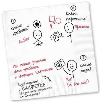 Наши читатели первыми познакомятся с… картинками из книги Дэна Роэма «Практика визуального мышления. Оригинальный метод решения сложных проблем» (в оригинале: «Unfolding the Napkin. The Hands-On Method for Solving Complex Problems with Simple Pictures»), которая вскоре выйдет в издательстве «Манн, Иванов и Фербер».