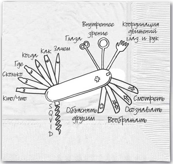 Итак, нарисованный ниже «швейцарский армейский нож» – метод Visual Thinking целиком на одной картинке. Здесь и три базовых инструмента визуального мышления, которые всегда с вами (глаза, внутреннее зрение, руки), и четыре этапа Visual Thinking (посмотреть , увидеть , вообразить, показать другим), и пять вопросов инструмента SQVID (просто или детально? качественно или количественно? видение или исполнение? индивидуальные характеристики или сравнение? изменения или статус-кво?) и шесть способов восприятия образов нашим мозгом, которым соответствуют шесть типов изображений (типа: «кто/что», «сколько», «где», «когда», «как», «почему/зачем»).