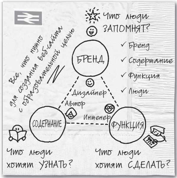 Возможно, этот ощетинившийся инструмент вам слегка напомнил ветвистые «деревья» ментальных карт? На самом деле, подобие случайно: между двумя методами нет ничего общего. Вот совершенно другой пример (с которого, к слову, и родился метод Visual Thinking). В свое время Дэна Роэма, сотрудника консалтинговой компании в Нью-Йорке, попросили в пожарном порядке выступить вместо коллеги в Шеффилде (Англия) на совещании по развитию удаленного образования. Должны были присутствовать важные персоны, включая премьер-министра Великобритании Тони Блэра – а времени на подготовку лекции и презентации PowerPoint уже не оставалось (встреча предстояла на следующее утро). Уже в вагоне-ресторане поезда Лондон-Шеффилд Роэм нарисовал на салфетке вот эту картинку. Она объяснила высокопоставленным чиновникам от образования все, что действительно имело значение в обсуждаемой теме, а также помогла структурировать дискуссию и сделать совещание продуктивным. Выступление самого Роэма прошло на «ура».