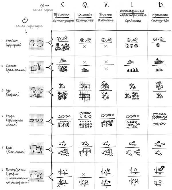Ниже – сведены на одном листе основные инструменты визуального мышления: метод SQVID и «Правило 6х6». В итоге получилось некое подобие визуальной «таблицы Менделева»: все возможные варианты типов рисунков для решения любого из шести существующих в мире проблем (типа «кто/что», «сколько» и др.). Шпаргалка по эффективному использованию метода Visual Thinking, которая будет всегда под рукой.