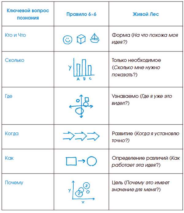 «Правило 6х6» из книги «Визуальное мышление» сведено ниже в одну таблицу с инструментом «Живой Лес» из книги «Бла-бла-бла». Столкнувшись с проблемой определенного типа, вы сможете прояснить ее суть для себя и других людей как с помощью рисунков, так и с помощью слов, не тратя время и внимание на лишние, пустые детали.